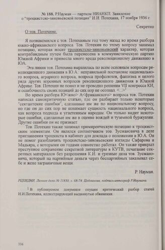 Р. Науман — партком НИАНКП Заявление о «троцкистско-зиновьевской позиции» И. И. Потехина, 17 ноября 1936 г. // РЦХИДНИ, Личное дело № 11830, л. 68-74. Подлинник подпись-автограф Р. Наумана.