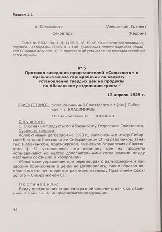 Протокол заседания представителей «Союзолото» и Крайкома Союза горнорабочих по вопросу установления твердых цен на продукты по Абаканскому отделению треста. 12 апреля 1929 г.