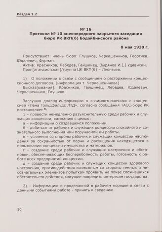 Протокол № 10 внеочередного закрытого заседания бюро РК ВКП(б) Бодайбинского района. 8 мая 1930 г. // ГАНО. Ф. П-2. Оп. 1. Д. 4286. Л. 461-462 об. Машинописный подлинник того времени.