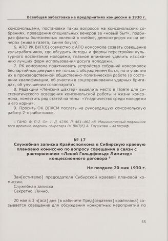 Служебная записка Крайисполкома в Сибирскую краевую плановую комиссию по вопросу совещания в связи с расторжением «Леной Гольдфильдс Лимитед» концессионного договора. Не позднее 20 мая 1930 г.