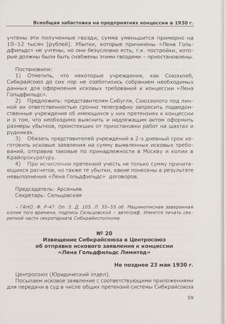 Извещение Сибкрайсоюза в Центросоюз об отправке искового заявления к концессии «Лена Гольдфильдс Лимитед». Не позднее 23 мая 1930 г. // ГАНО. Ф. Р-47. Оп. 5. Д. 105. Л. 58. Машинописная заверенная копия того времени.