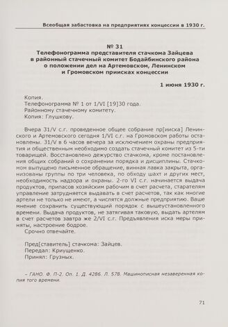 Телефонограмма представителя стачкома Зайцева в районный стачечный комитет Бодайбинского района о положении дел на Артемовском, Ленинском и Громовском приисках концессии. 1 июня 1930 г.