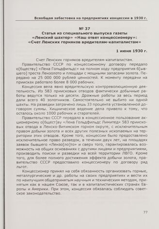 Статья из специального выпуска газеты «Ленский шахтер» «Наш ответ концессионеру»: «Счет Ленских горняков вредителям-капиталистам». 1 июня 1930 г.