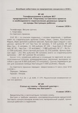 Телефонограмма в райком ВСГ председателю А.И. Георгиеву со Светлого прииска о необходимости перечисления денежных средств на нужды бастующих рабочих. 4 июня 1930 г.
