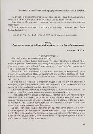 Статья из газеты «Ленский шахтер»: «К борьбе готовы». 4 июня 1930 г. // ГАНО. Ф. П-2. Оп. 1. Д. 4286. Л. 593 об. Типографский экземпляр.