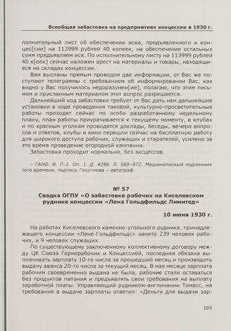 Сводка ОГПУ «О забастовке рабочих на Киселевском руднике концессии «Лена Гольдфильдс Лимитед». 10 июня 1930 г. // ГАНО. Ф. Р-627. Оп. 2а. Д. 15. Л. 380-385. Машинописная заверенная копия того времени.