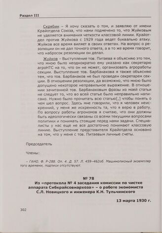 Из «протокола № 4 заседания комиссии по чистке аппарата Сибкрайсовнархоза» - о работе экономиста С.Л. Новицкого и инженера К.Н. Тульчинского. 13 марта 1930 г. // ГАНО. Ф. Р-288. Оп. 4. Д. 179. Л. 71, 73-76 об. Машинописный подлинник.
