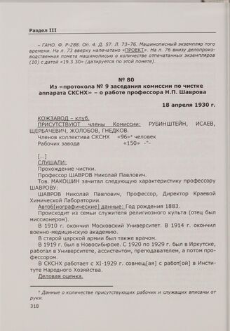 Из «протокола № 9 заседания комиссии по чистке аппарата СКСНХ» - о работе профессора Н.П. Шаврова. 18 апреля 1930 г. // ГАНО. Ф. Р-288. Оп. 4. Д. 179. Л. 98, 102-108, 110. Машинописный подлинник.