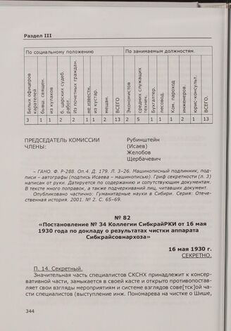 Постановление № 34 Коллегии СибкрайРКИ от 16 мая 1930 года по докладу о результатах чистки аппарата Сибкрайсовнархоза. 16 мая 1930 г. // ГАНО. Ф. Р-288. Оп. 1. Д. 1381. Л. 110. Машинописный подлинник. Опубликовано: Власть и интеллигенция в Сибирской провинции. У истоков советской модернизации. 1926-1932: сборник документов. Новосибирск, 1999. С. 190-191.