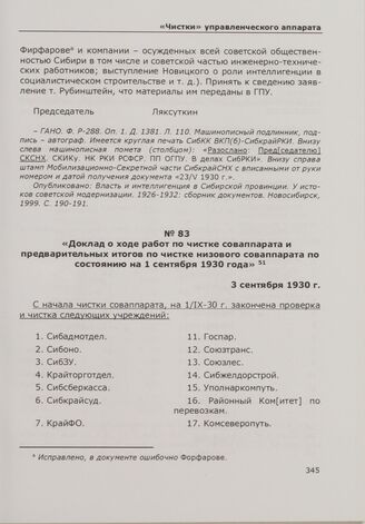 Доклад о ходе работ по чистке соваппарата и предварительных итогов по чистке низового соваппарата по состоянию на 1 сентября 1930 года. 3 сентября 1930 г. // ГАНО. Ф. Р-1072. Оп. 1. Д. 311б. Л. 86-95. Машинописный подлинник.