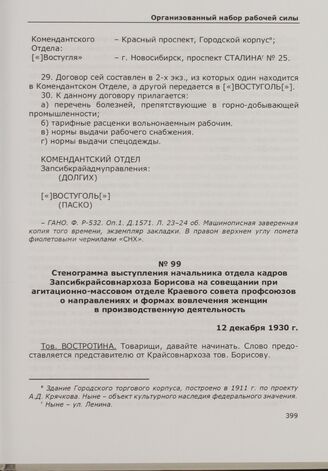 Стенограмма выступления начальника отдела кадров Запсибкрайсовнархоза Борисова на совещании при агитационно-массовом отделе Краевого совета профсоюзов о направлениях и формах вовлечения женщин в производственную деятельность. 12 декабря 1930 г. // ГАНО. Ф. Р-532. Оп. 1. Д. 1375. Л. 48-58. Машинописный экземпляр того времени с рукописной правкой.