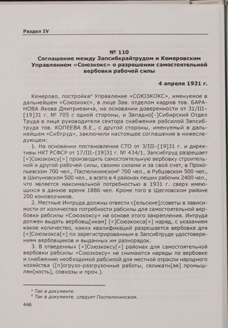 Соглашение между Запсибкрайтрудом и Кемеровским Управлением «Союзкокс» о разрешении самостоятельной вербовки рабочей силы. 4 апреля 1931 г. // ГАНО. Ф. Р-532. Оп. 1. Д. 1627. Л. 25-25 об. Машинописный подлинник.