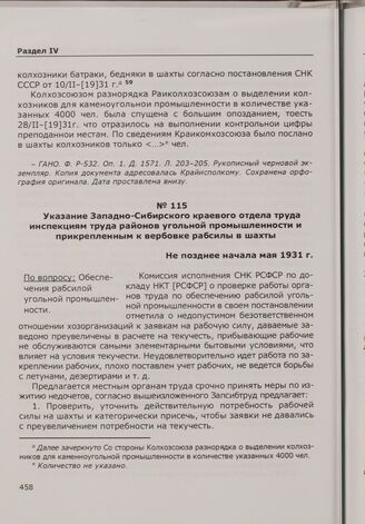 Указание Западно-Сибирского краевого отдела труда инспекциям труда районов угольной промышленности и прикрепленным к вербовке рабсилы в шахты. Не позднее начала мая 1931 г. // ГАНО. Ф. Р-532. Оп. 1. Д. 1571. Л. 209-210. Машинописный подлинник.