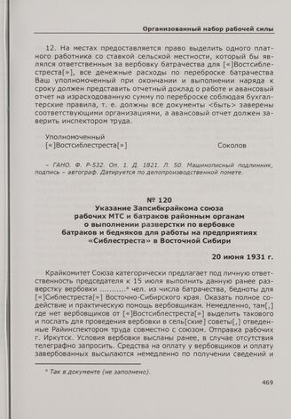 Указание Запсибкрайкома союза рабочих МТС и батраков районным органам о выполнении разверстки по вербовке батраков и бедняков для работы на предприятиях «Сиблестреста» в Восточной Сибири. 20 июня 1931 г. // ГАНО. Ф. Р-532. Оп. 1. Д. 1821. Л. 64. Машинописная копия того времени.
