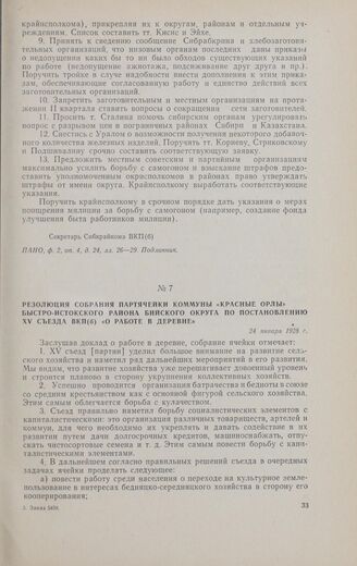 Резолюция собрания партячейки коммуны «Красные орлы» Быстро-Истокского района Бийского округа по постановлению XV съезда ВКП(б) «О работе в деревне». 24 января 1928 г. // ПААК, ф. 12, oп. 3, д. 158, л. 108. Заверенная копия. Рукопись.