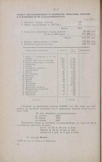 Сводка Сибсельскосоюза о количестве прокатных пунктов в крае и оснащенности их сельхозинвентарем. 1 мая 1928 г. // ПАНО, ф. 2, oп. 1, д. 2603, л. 31. Подлинник.
