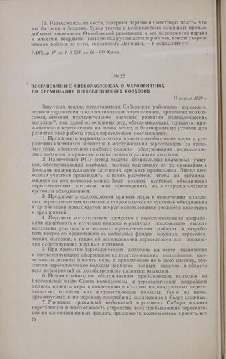 Постановление Сибколхозсоюза о мероприятиях по организации переселенческих колхозов. 18 апреля 1929 г. // ГАТО, ф. 206, oп. 1, д. 1, л. 71. Копия.
