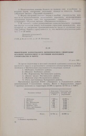 Информация Барнаульского окрколхозсоюза Сибирскому краевому колхозсоюзу о состоянии колхозного строительства в округе. 15 июля 1929 г. // ГААК, ф. 66, oп. 1, д. 61, лл. 29—30. Отпуск.