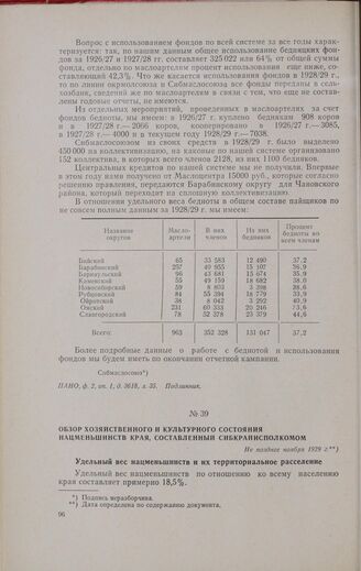 Обзор хозяйственного и культурного состояния нацменьшинств края, составленный Сибкрайисполкомом. Не позднее ноября 1929 г. // ГАНО, ф. 47, oп. 1, д. 496, лл. 15—19. Копия.