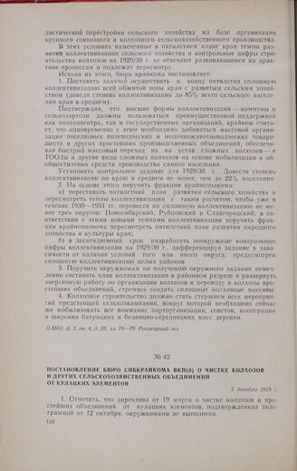 Постановление бюро Сибкрайкома ВКП(б) о чистке колхозов и других сельскохозяйственных объединений от кулацких элементов. 5 декабря 1929 г.