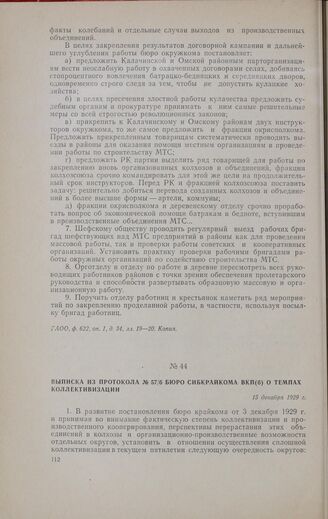 Выписка из протокола № 57/б бюро Сибкрайкома ВКП(б) о темпах коллективизации. 15 декабря 1929 г.