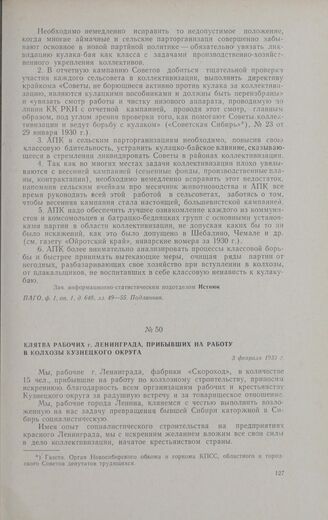 Клятва рабочих г. Ленинграда, прибывших на работу в колхозы Кузнецкого округа. 3 февраля 1930 г. // Газета «Кузбасс», № 27 от 3 февраля 1930 г.