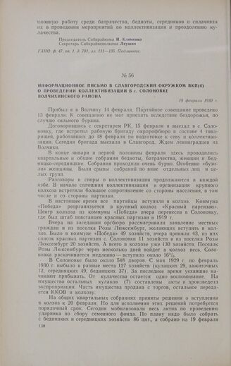 Информационное письмо в Славгородский окружком ВКП(б) о проведении коллективизации в с. Солоновке Волчихинского района. 19 февраля 1930 г.
