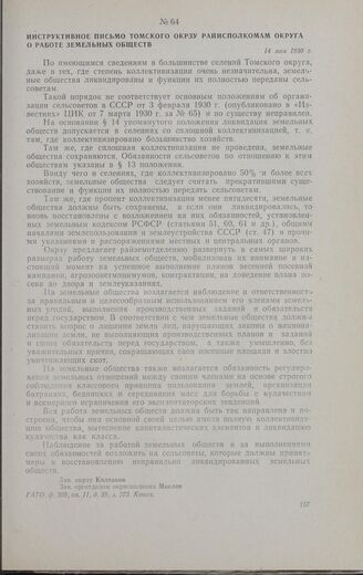 Инструктивное письмо Томского окрзу райисполкомам округа о работе земельных обществ. 14 мая 1930 г. // ГАТО, ф. 309, oп. 11, д. 39, л. 273. Копия.
