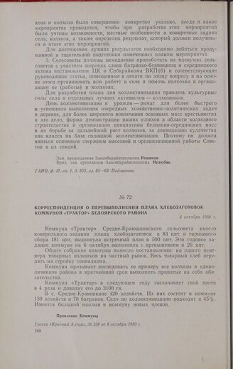 Корреспонденция о перевыполнении плана хлебозаготовок коммуной «Трактор» Белоярского района. 8 октября 1930 г. // Газета «Красный Алтай», № 238 от 8 октября 1930 г.