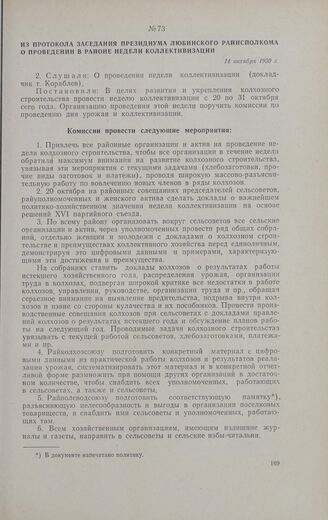 Из протокола заседания президиума Любинского райисполкома о проведении в районе недели коллективизации. 14 октября 1930 г. // ГАОО, ф. 1328, oп. 1, д. 40, л. 129. Подлинник.
