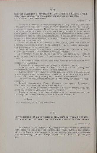 Корреспонденция об улучшении организации труда в колхозе «Путь Ильича» Сыропятского сельсовета Корниловского района. 11 апреля 1931 г.