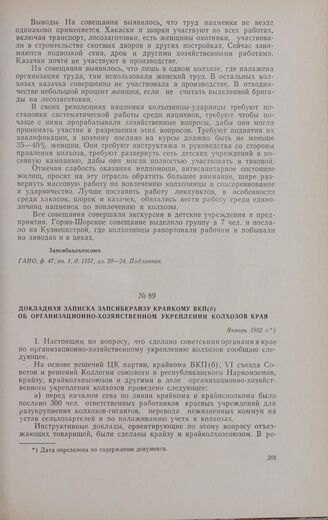 Докладная записка Запсибкрайзу крайкому ВКП(б) об организационно-хозяйственном укреплении колхозов края. Январь 1932 г. // ПАНО, ф. 3, oп. 2, д. 350, лл. 15—27. Подлинник.