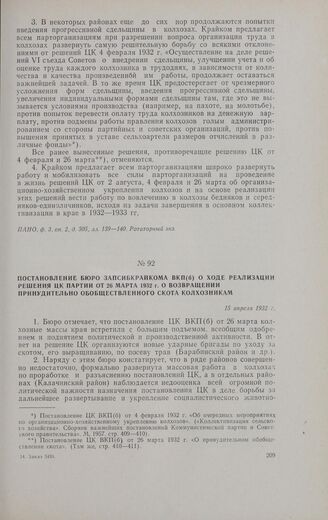 Постановление бюро Запсибкрайкома ВКП(б) о ходе реализации решения ЦК партии от 26 марта 1932 г. о возвращении принудительно-обобществленного скота колхозникам. 15 апреля 1932 г.
