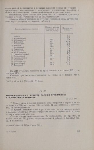 Корреспонденция о шефской помощи предприятий г. Новокузнецка колхозам. 14 июля 1934 г.