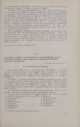 Докладная записка сельхозотдела Запсибкрайкома ВКП(б) крайкому партии о ходе работ по закреплению навечно земель за колхозами. Не ранее.20 ноября 1935 г. // ПАНО, ф. 3, oп. 9, д. 954, лл. 175—186. Копия.