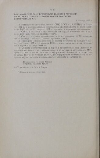 Постановление № 488 президиума Томского горсовета о снятии с колхозов задолженности по ссудам и натуроплате МТС. 8 сентября 1937 г.