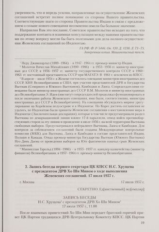 Запись беседы первого секретаря ЦК КПСС Н. С. Хрущева с президентом ДРВ Хо Ши Мином о ходе выполнения Женевских соглашений. Москва, 17 июля 1957 г.