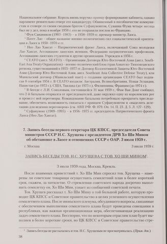 Запись беседы первого секретаря ЦК КПСС, председателя Совета министров СССР Н. С. Хрущева с президентом ДРВ Хо Ши Мином об обстановке в Лаосе и отношениях СССР с ОАР. Москва, 3 июля 1959 г.