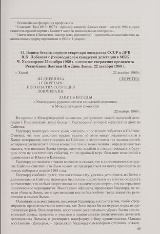 Запись беседы первого секретаря посольства СССР в ДРВ В. К. Лобачева с руководителем канадской делегации в МКК Ч. Уадсвордом 22 ноября 1960 г. о попытке свержения президента Республики Вьетнам Нго Динь Зьема. Ханой, 22 декабря 1960 г. // РГАНИ. Ф. 5. Oп. 49. Д. 444. Л. 1-2. Подлинник. Машинописный текст, подпись - автограф В. К. Лобачева.