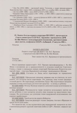 Запись беседы первого секретаря ЦК КПСС, председателя Совета министров СССР Н. С. Хрущева с президентом ДРВ Хо Ши Мином о международном положении, противостоянии двух систем, конфликте СССР с Албанией. Пицунда, 17 августа 1961 г.