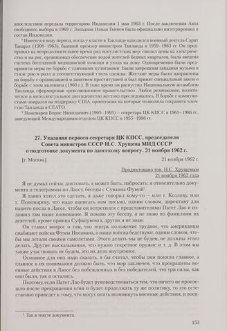 Указания первого секретаря ЦК КПСС, председателя Совета министров СССР Н. С. Хрущева МИД СССР о подготовке документа по лаосскому вопросу. Москва, 21 ноября 1962 г. // РГАНИ. Ф. 52. Oп. 1. Д. 601. Л. 21-26. Копия. Машинописный текст.