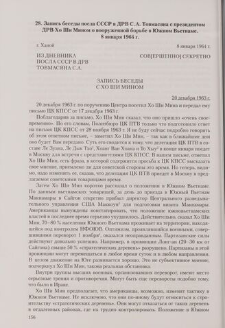 Запись беседы посла СССР в ДРВ С. А. Товмасяна с президентом ДРВ Хо Ши Мином о вооруженной борьбе в Южном Вьетнаме. Ханой, 8 января 1964 г.