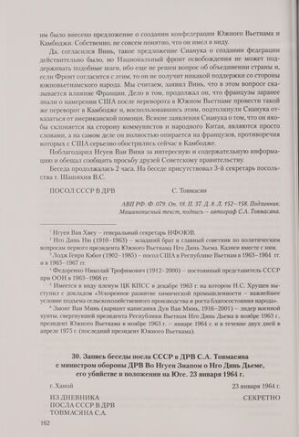 Запись беседы посла СССР в ДРВ С. А. Товмасяна с министром обороны ДРВ Во Нгуен Зиапом о Нго Динь Дьеме, его убийстве и положении на Юге. Ханой, 23 января 1964 г. // АВП РФ. Ф. 079. Oп. 18. П. 37. Д. 8. Л. 162-163. Подлинник. Машинописный текст, подпись - автограф С. А. Товмасяна.