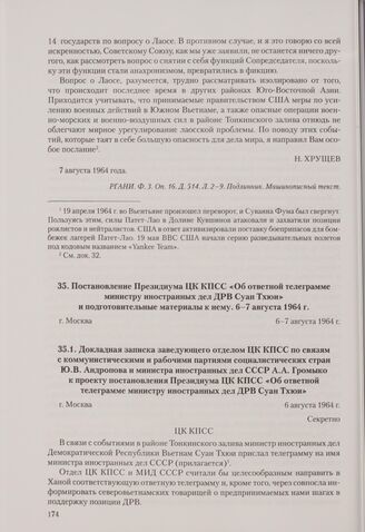 Постановление Президиума ЦК КПСС «Об ответной телеграмме министру иностранных дел ДРВ Суан Тхюи» и подготовительные материалы к нему. Москва, 6-7 августа 1964 г. Докладная записка заведующего отделом ЦК КПСС по связям с коммунистическими и рабочими партиями социалистических стран Ю. В. Андропова и министра иностранных дел СССР А. А. Громыко к проекту постановления Президиума ЦК КПСС «Об ответной телеграмме министру иностранных дел ДРВ Суан Тхюи». 6 августа 1964 г. // РГАНИ, Ф, 3. Oп. 16. Д. 514. Л. 17. Подлинник. Машинописный текст, подписи - автографы Ю. В. Андропова и А. Л. Громыко.