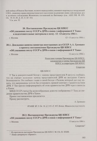 Постановление Президиума ЦК КПСС «Об указаниях послу СССР в ДРВ в связи с информацией У Тана» и подготовительные материалы к нему. Москва, 12-13 августа 1964 г. Постановление Президиума ЦК КПСС «Об указаниях послу СССР в ДРВ в связи с информацией ...