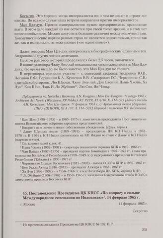 Постановление Президиума ЦК КПСС «По вопросу о созыве Международного совещания по Индокитаю». Москва, 14 февраля 1965 г.