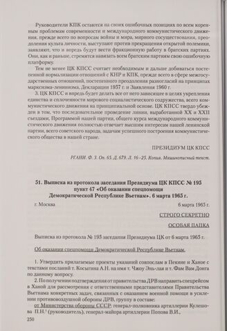 Выписка из протокола заседания Президиума ЦК КПСС № 195 пункт 47 «Об оказании спецпомощи Демократической Республике Вьетнам». Москва, 6 марта 1965 г. // РГАНИ. Ф. 3. Oп. 65. Д. 679. Л. 52-58. Копия. Машинописный текст.