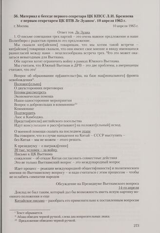 Материал к беседе первого секретаря ЦК КПСС Л. И. Брежнева с первым секретарем ЦК ПТВ Ле Зуаном. Москва, 10 апреля 1965 г. // РГАНИ. Ф. 80. Oп. 1. Д. 517. Л. 10-14. Подлинник. Рукописный текст.