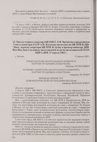 Письмо первого секретаря ЦК КПСС Л. И. Брежнева и председателя Совета министров СССР А. Н. Косыгина председателю ЦК ПТВ Хо Ши Мину, первому секретарю ЦК ПТВ Ле Зуану и премьер-министру ДРВ Фам Ван Донгу по поводу трехсторонней встречи представителей СССР, КНР и ДРВ. Москва, 17 апреля 1965 г. // РГАНИ. Ф. 80. Oп. 1. Д. 517. Л. 15-16. Копия. Машинописный текст.