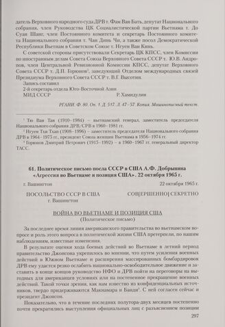 Политическое письмо посла СССР в США А. Ф. Добрынина «Агрессия во Вьетнаме и позиция США». Вашингтон, 22 октября 1965 г. // АВП РФ. Ф. 0129. Oп. 49. П. 375. Д. 13. Л. 81-91. Подлинник. Машинописный текст, подпись и дата - автограф А. Ф. Добрынина.